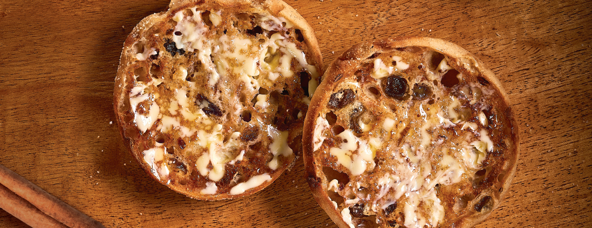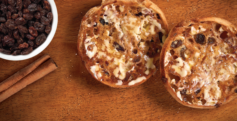 BAYS® Cinnamon Raisin English Muffins come pre-sliced, and packed with plump raisins and a dash of cinnamon. They’re tasty, sweet, and perfect with butter or as the best French toast ever.